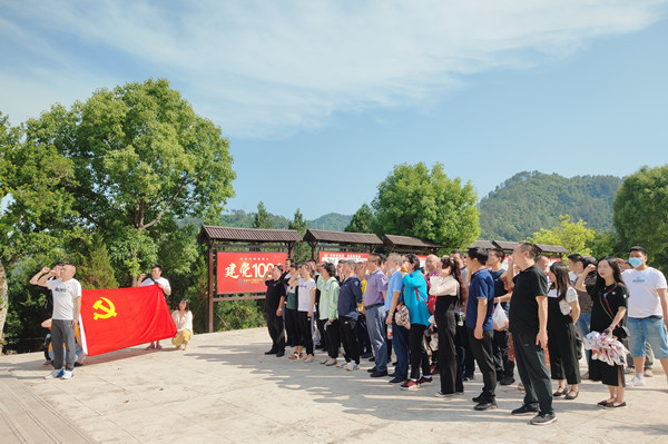 在柏林镇烈士纪念园,党员们面向烈士纪念碑重温入党誓词,学习解放战争时期为夺取黄龙渡口控制权同国民党军队英勇奋战献出宝贵生命的烈士事迹,向烈士们鞠躬致敬,深切缅怀他们的丰功伟绩。