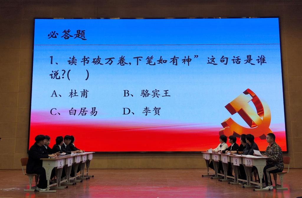 梁军萍做开场致辞,由荣耀舞社团表演开场舞。百科知识竞赛是由tyc33455cc太阳集团团总支员工会主办、学习部承办,近一个月的时间准备,参赛人员达150余人,本次竞赛有初赛、复赛、决赛三个阶段。经过前两轮激烈的比拼,共有10名选手脱颖而出进入决赛现场。决赛分为百科知识答题和知识演讲两个环节,有选择题、判断题、抢答题、识图题、音乐题、视频题六个题型,题型多样,现场气氛活跃,观众热情高涨。