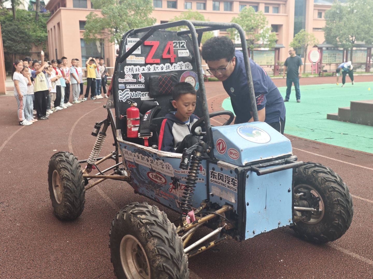 张勇副经理介绍完“巴哈赛车进校园”科技活动的意义后,一段5分钟的纪录片拉开了活动序幕。镜头里,车队队员在实训基地通宵焊接车架、组装、调试赛车,在南浔赛场爬坡过坎的画面一出现,操场瞬间安静,孩子们屏息仰望,大赞巴哈赛车的神奇。纪录片结束,队长瞿凌志举起碳纤维头盔,用“赛车为什么要戴‘大蛋壳’”做引子,把安全带、防滚架、灭火开关等知识拆成“闯关题”,现场抢答声此起彼伏。